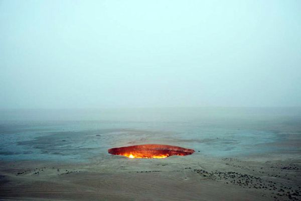 В 1971 году возле деревни Дарваза в Туркменистане советские геологи обнаружили скопление подземного газа. В результате раскопок и бурения разведочной скважины геологи наткнулись на подземную каверну (пустоту), из-за чего земля провалилась и образовалась большая дыра, наполненная газом. © flickr.com / Tormod Sandtorv
