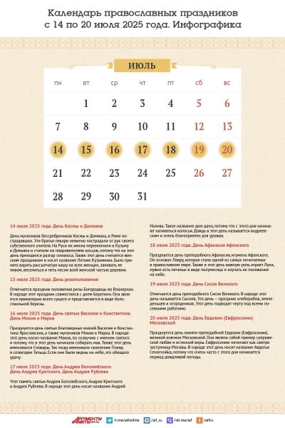 Неделя 14-20 июля — следующая после окончания Петрова (Апостольского) поста. На этой неделе вспоминают Евфросинию Московскую, князей Василия и Константина, трех святых Андреев.