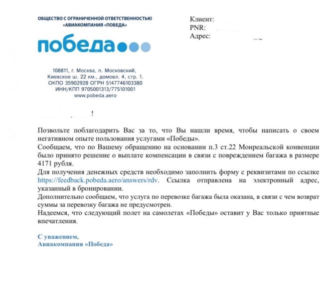 Как выглядит ответ авиакомпании на претензию о повреждении багажа