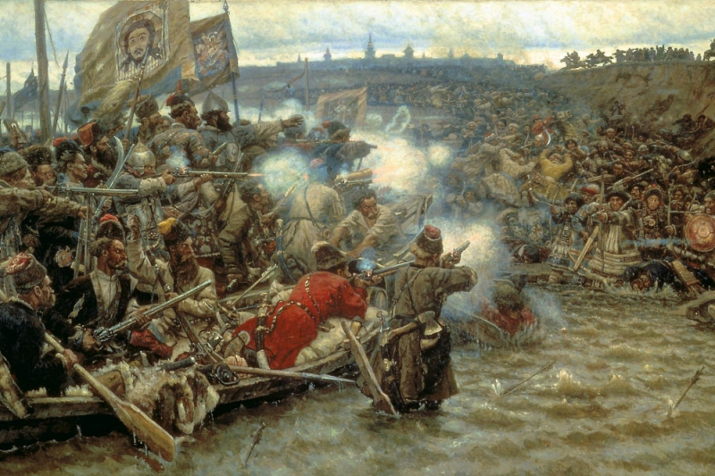 Картина русского живописца Василия Сурикова «Покорение Сибири Ермаком Тимофеевичем» (работа была окончена в 1895 году). Сюжет: решающий бой на Чувашевом мысу между казачьей дружиной Ермака и воинами сибирского хана Кучума в 1582 году. Фото: Commons.wikimedia.org