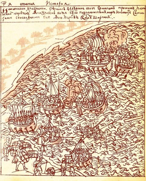 Детали миниатюры из Ремезовской летописи: «И въ каковой храбрости Германъ въ дружине своей Ермакомъ прослывъ и атаманомъ нареченъ, яко зраченъ, воюя бусы по Хвалынскому морю и на Волге со многими своевольными вои, яко и царскую казну шарпалъ». Фото: Commons.wikimedia.org