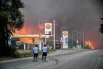 Люди наблюдают, как полыхает лесной пожар возле автозаправочной станции в Ахайе, Греция. © Reuters