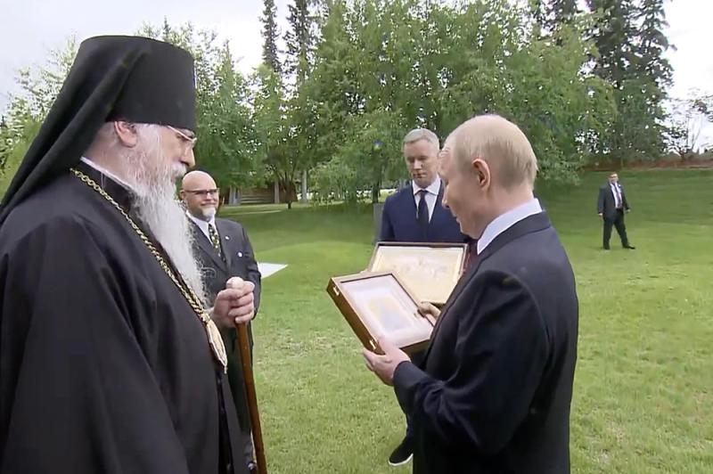 Владимир Путин вручил настоятелю православного храма в Анкоридже икону святого Германа Аляскинского. Кадр из видео