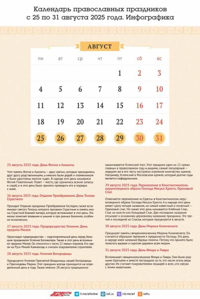 Календарь православных праздников с 25 по 31 августа 2025 года. Инфографика