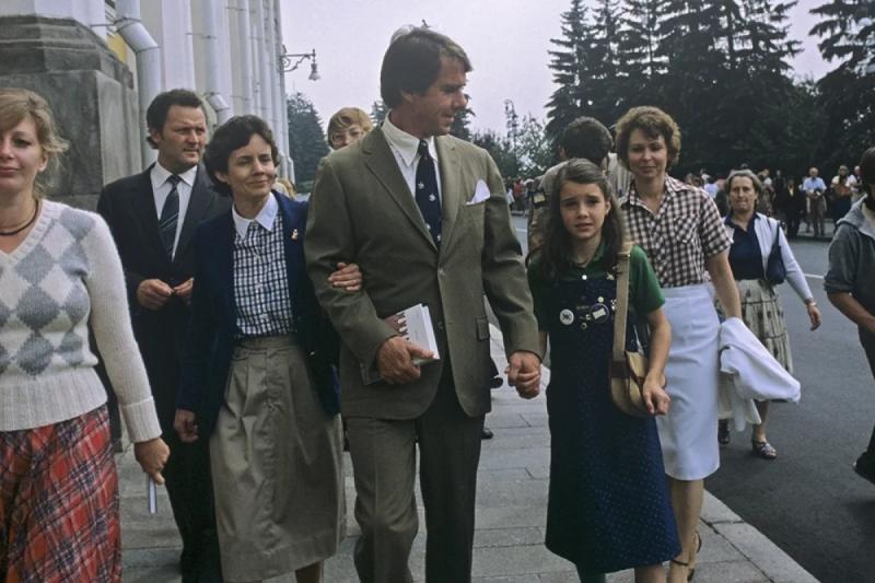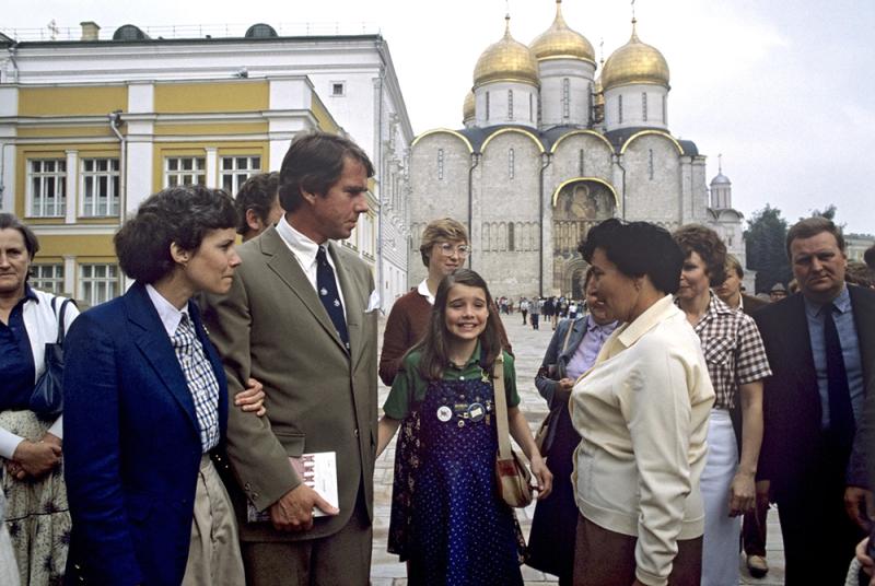 Американская девочка Саманта Смит, посетившая СССР по приглашению Генерального секретаря ЦК КПСС Юрия Андропова, с родителями на Соборной площади Московского Кремля, 1983 год. Фото: РИА Новости/ Юрий Абрамочкин