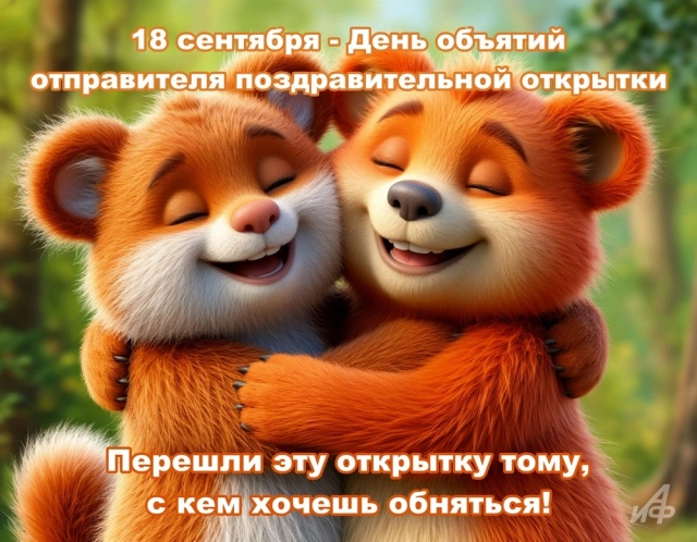 А еще 18 сентября вы получите шанс обнять того, кто вам нравится. День объятий отправителя поздравительной открытки как раз и задумывался для того, чтобы вы могли отправить красивую картинку с душевным пожеланием и получить в ответ обнимашки. Не упустите этот день!