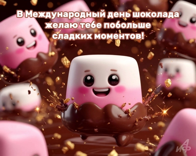 В Международный день шоколада нужно обязательно угостить друхей шоколадом. Ну и самому не упустить возможность полакомиться. А всем, кого не сможете поздравить лично, отправляйте эту веселую открытку. И пусть у них все будет в шоколаде!