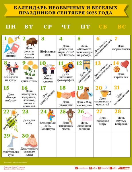 Сентябрь подарит россиянам целый букет из необычных праздников. Один из самых осенних, например, отмечается 3 сентября — так называемый Шуфутинов день, или День прощания, когда вспоминают ушедшее лето и поют хит Михаила Шуфутинского про календарь и третье сентября. Больше забавных торжеств — в инфографике aif.ru.