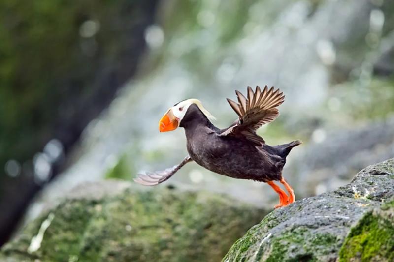 Перед вами — топорок, морская птица с Командорских островов. Он живёт сразу в трёх стихиях: на воде, на суше и в воздухе. Но с полётами у топорков, откровенно говоря, не всё гладко. Их крылья коротковаты, а тело — плотное, тяжёлое. Чтобы взлететь, нужна высота. Чтобы спланировать к воде, нужна смелость. Особенно если ты молод и это твой первый полёт. А полететь нужно. В буквальном смысле во взрослую жизнь. Ещё секунду назад это был птенец, которого кормили, согревали, оберегали. И всё, что дальше, — уже только его история.