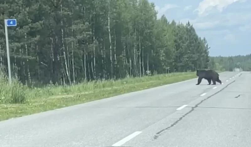 Неспешно переходящий трассу медведь в Ульяновской области. © Telegram-канал «Товарищ Плигузов» / Telegram-канал