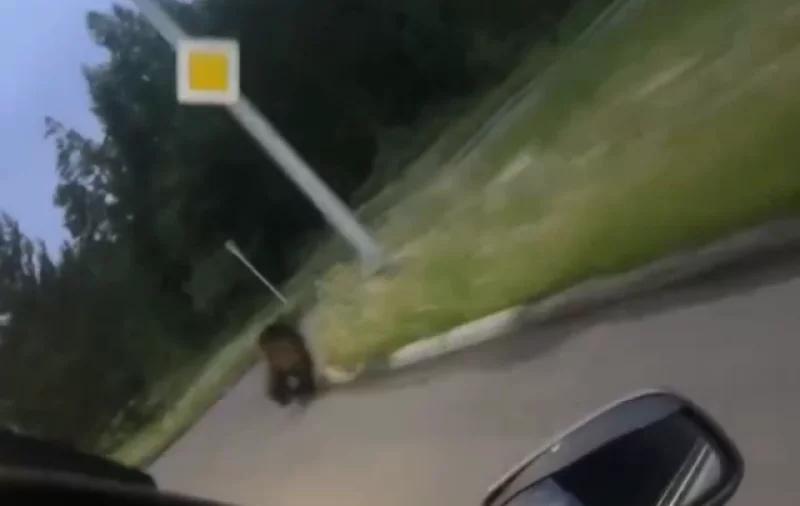 Испугавшийся медведь удирает от автомобиля в Усть-Илимске. Инцидент Усть-Илимск