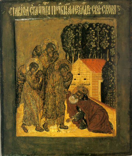 Родился святой в простой крестьянской семье в селе Мандера на реке Оять. В 19 лет он тайно ушел на Валаам, где принял постриг, и около 25 лет провел в полном уединении и строгом подвижничестве на берегу Рощинского озера. Существует предание, что после нескольких лет отшельничества Свирскому, единственному из русских святых, явилась Святая Троица в виде Трех Ангелов, — это событие сравнивается с явлением Троицы ветхозаветному праотцу Аврааму. Затем святой Александр Свирский основал обитель, позднее названную Александро-Свирским монастырем. Он стал ее первым игуменом, прославившимся даром прозорливости и чудотворений.