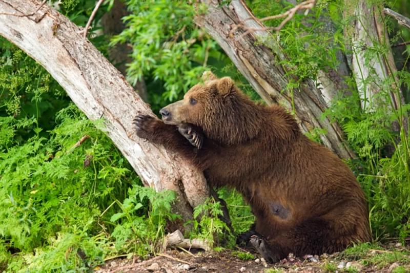 Рядом с этой медведицей я провел почти весь день. Все это время она ловила рыбу для себя и своих трех медвежат. И вот наконец сытые и довольные медвежата нашли себе занятие по душе, резвясь у воды. А матуха присела у дерева на берегу перевести дух. Ее лапы сложены вместе и опираются на ствол дерева, который будто специально изогнулся, создавая идеальную опору для ее головы. А взгляд медведицы устремлен вдаль, вдоль тихого берега озера. В этой позе есть что-то по-человечески понятное, почти философское, как если бы она задумалась о чем-то далеком и важном.