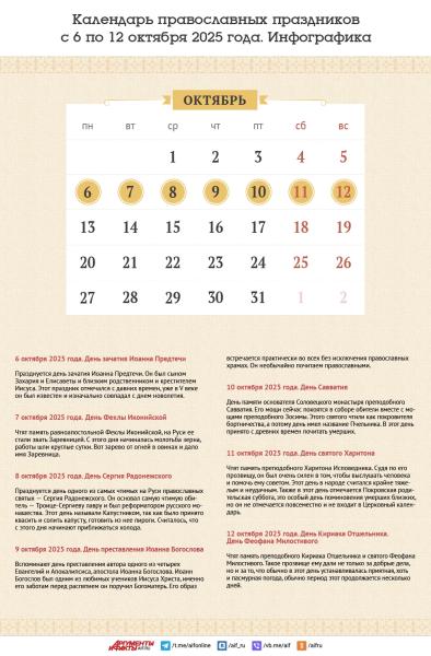 На неделе 6-12 октября 2025 года празднуется день зачатия Иоанна Предтечи и памяти Сергия Радонежского. Также на этой неделе вспоминают Иоанна Богослова — апостола, которому Иисус поручил заботу о своей матери.