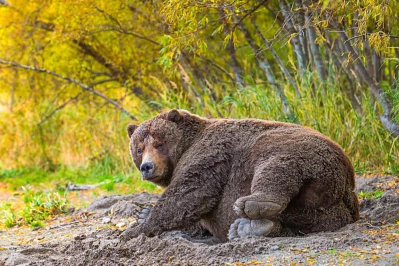 Она лежала на песке у самой кромки воды. Огромная, мягкая, сияющая бархатным мехом на фоне жёлтой листвы. Не спала, но и не бодрствовала. Просто была. В полной гармонии с собой и окружающим миром. Я подошёл достаточно близко — и только после первых щелчков камеры медведица чуть приподняла голову и посмотрела на меня. Без удивления, без страха. Как будто мы с ней старые знакомые. Или как будто она знала, что её фотографируют, и была к этому готова.