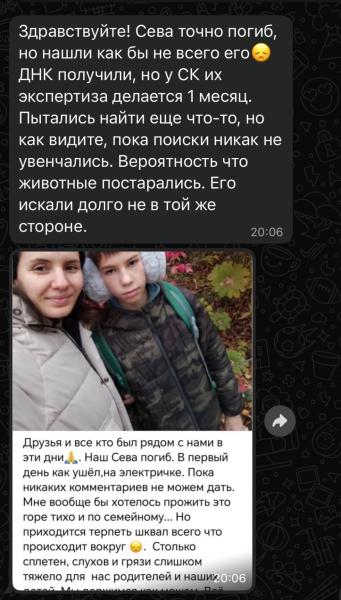 В чате поисков мама Севы сообщила, что тело до сих пор не найдено.