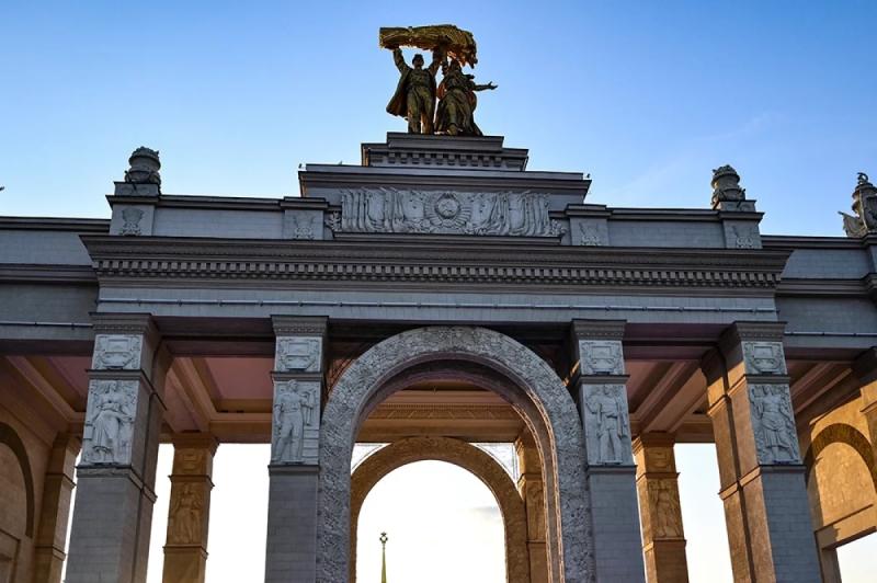 Подхожу к главному входу. Вот она, прямо перед моими глазами, огромная, величественная арка. На самом верху возвышаются тракторист и колхозница, в их руках, как и обычно, сноп колосьев…