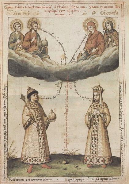 Рисунок, расположенный в начале «Книги любви знак в честен брак», преподнесённой в 1689 г. в качестве свадебного подарка Петру Первому. Фото: репродукция