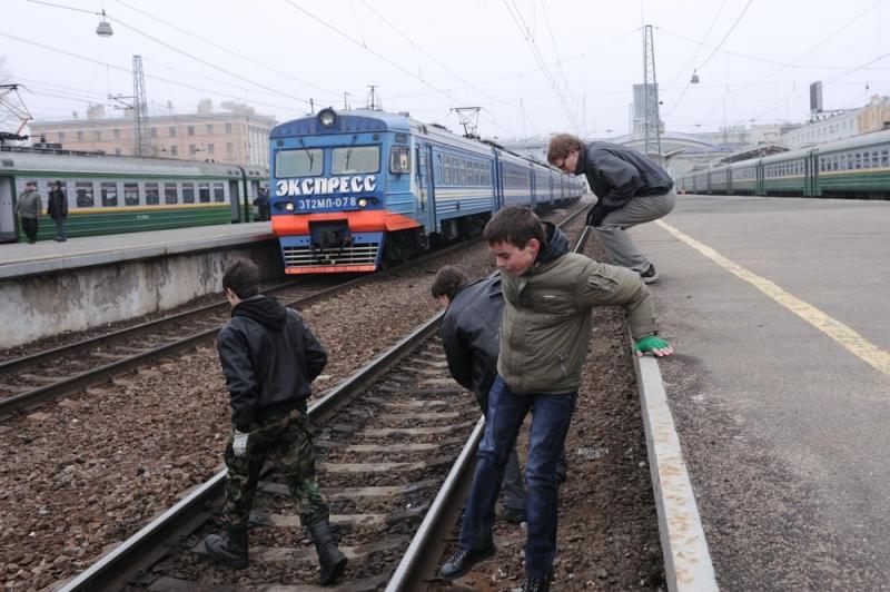 Молодые люди, называющие себя зацеперами, переходят железнодорожные пути на одном из вокзалов Санкт-Петербурга. Для зацепера принципиально важно проехать на электричке бесплатно любым способом. Это для них не просто способ сэкономить на проезде, но и экстремальное хобби. Фото: РИА Новости/ Сергей Ермохин