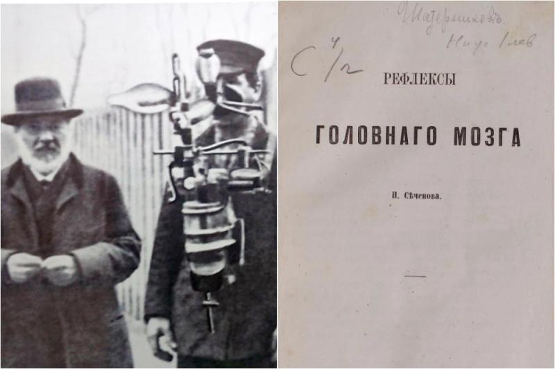 Сеченов и портативный газоанализатор его конструкции; Титульный лист книги учёного «Рефлексы головного мозга». Это классический труд русского физиолога и психолога. Фото: Коллаж АиФ