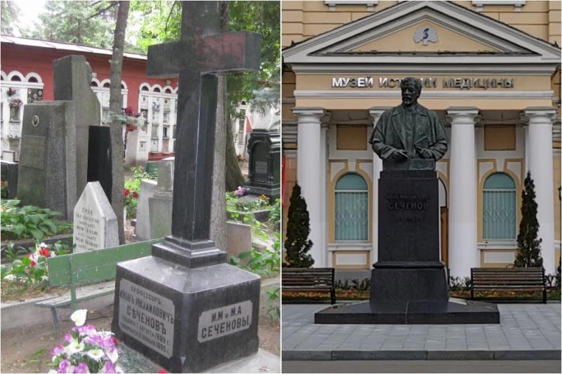 Могила Сеченова и его жены на Новодевичьем кладбище; Памятник ученому в Москве. Фото: Коллаж АиФ Оцените материал