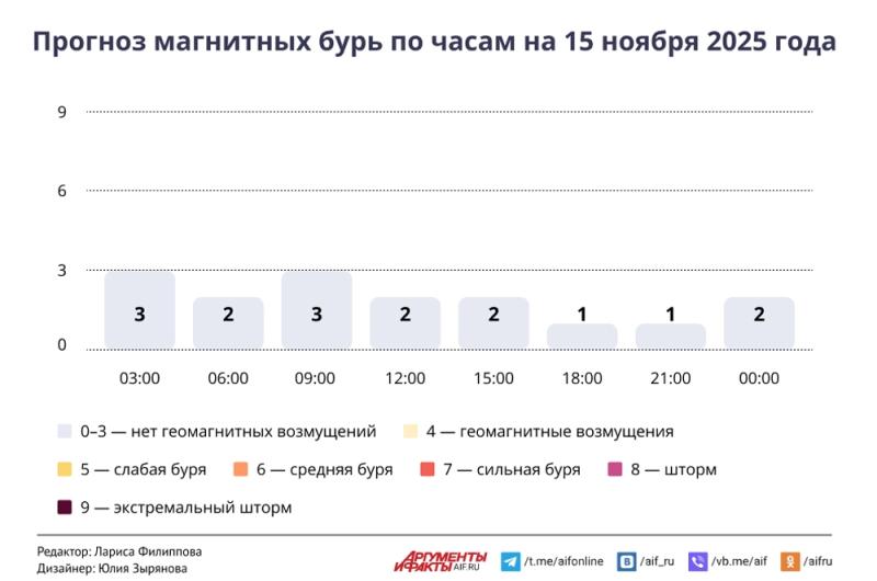 Прогноз магнитных бурь по часам на 15 ноября 2025 года. Инфографика