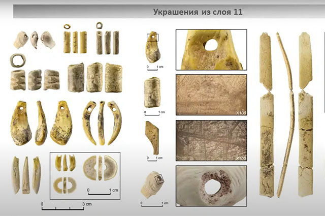 «Мы можем говорить о том, что здесь на местной основе формировалась культура поведения современного человека, — отметил Михаил Шуньков. — Об этом говорят разнообразные украшения из зубов животных, бивня мамонта, поделочного камня, а также иглы с ушком».