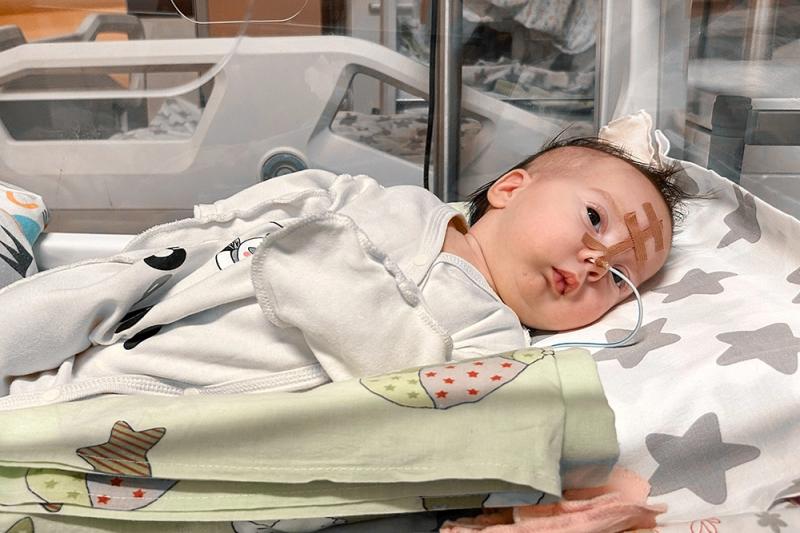 Уже по первому Сашиному крику в родзале все насторожились: он был хриплый, глухой, как будто что-то препятствовало звуку. Оказалось, что у девочки настолько недоразвита нижняя челюсть, что она смещается назад, сужая гортань и заставляя язык западать в горло. Малышка сразу оказалась в реанимации: дышать самостоятельно Саша может только лёжа в определённом положении, а глотать не может вовсе, кормят её через зонд. Лежать на спине ни в коем случае нельзя — сразу задыхается, синеют губы, можно укладывать только на бочок, отвернув голову в сторону. Из-за этого у Саши уже вытянутый затылок, а в груди, в районе солнечного сплетения, из-за трудностей с вдыханием воздуха маленькая ямка. Нужна помощь! Александре Коруняк (2 месяца, г. Набережные Челны) необходима операция по удлинению челюсти стоимостью 808 тысяч рублей.