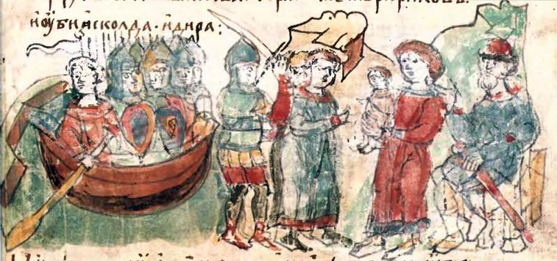 Тайное прибытие военной дружины Олега в Угорское под Киевом; провозглашение малолетнего Игоря наследником киевского престола; убийство Аскольда и Дира по приказу Олега. Миниатюра Радзивилловской летописи. Фото: Commons.wikimedia.org
