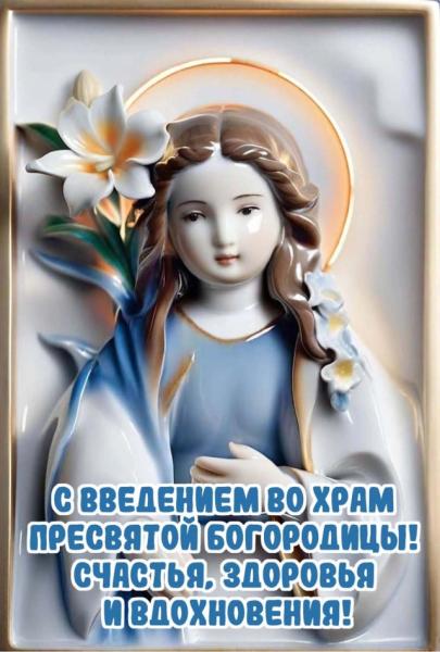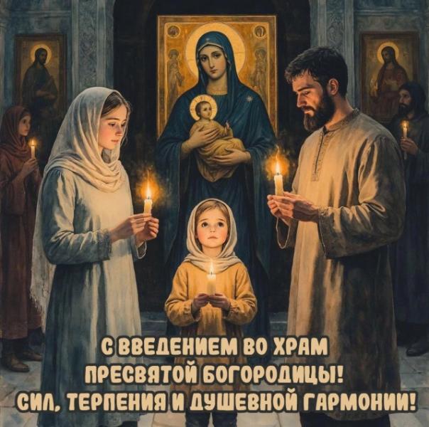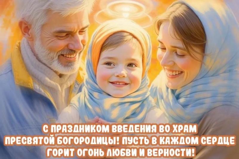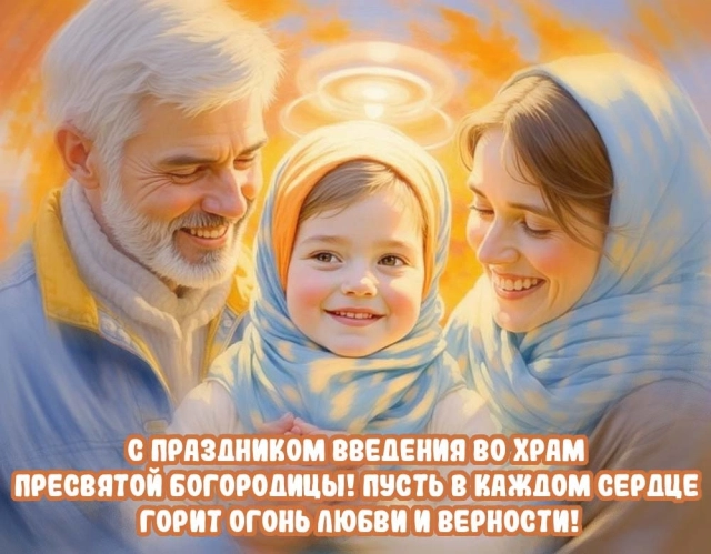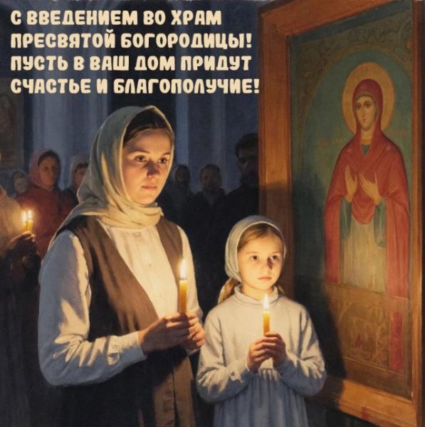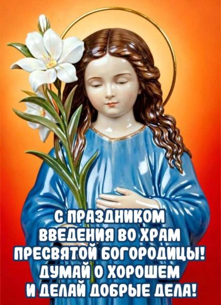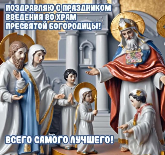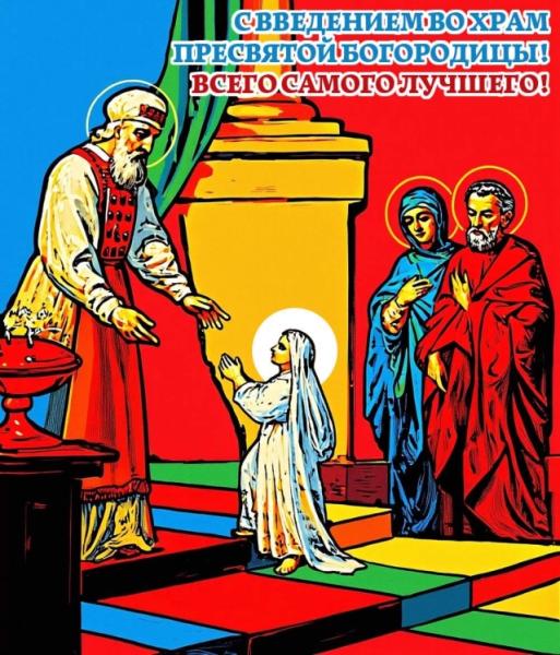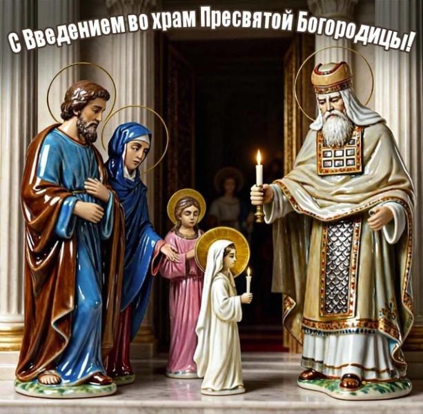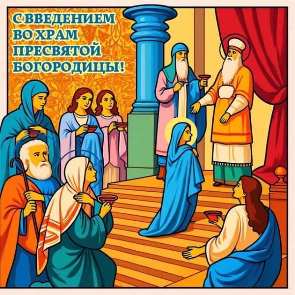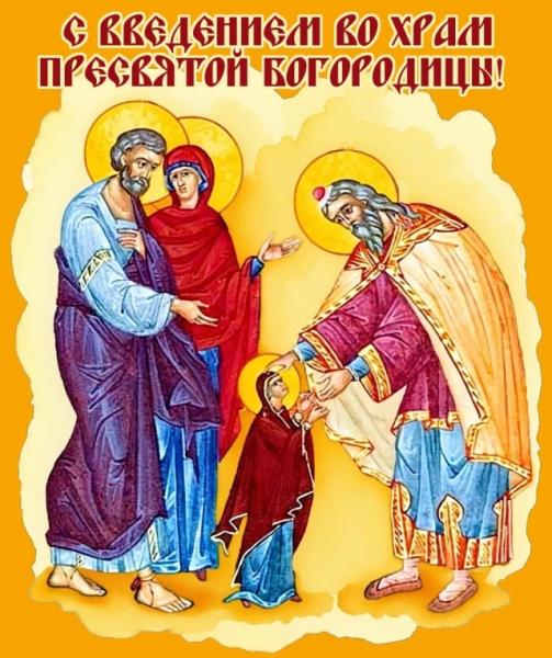 История этого праздника такова: когда Марии исполнилось 3 года, ее родители — святые Иоаким и Анна привели девочку к главному храму Иерусалима. Там их встретил первосвященник Захария – отец Иоанна Крестителя, и отвел юную Богородицу в святая святых храма. Там она и воспитывалась до 15 лет.