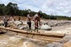 Полицейские переносят местного жителя по деревянному мосту в районе, пострадавшем от смертоносных оползней. © Reuters
