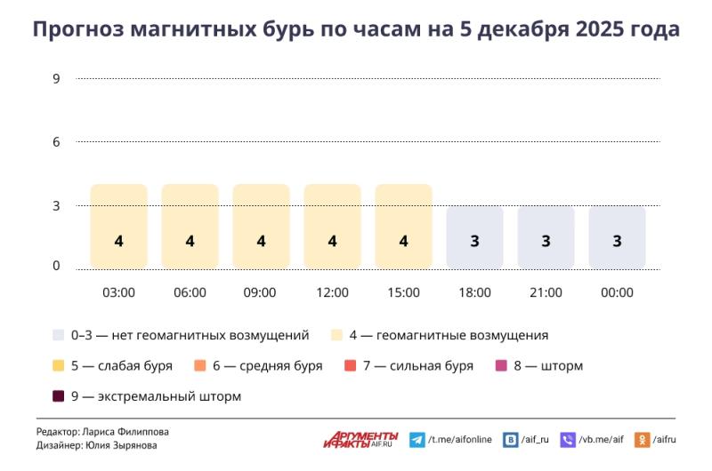 После магнитной бури, произошедшей накануне, 5 декабря 2025 года еще сохранятся геомагнитные возмущения. Вероятность магнитной бури составляет 50 процентов.