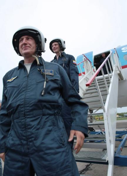 Старший летчик-испытатель «Гражданских самолетов Сухого» Александр Яблонцев (на первом плане) и летчик-испытатель Леонид Чикунов (на втором плане), пилотировашие новейший российский гражданский лайнер «Суперджет-100», который совершил свой первый полет. Самолет поднялся с взлетно-посадочной полосы на производственной площадке в Комсомольске-на-Амуре и провел в воздухе 1 час 5 минут. Фото: РИА Новости