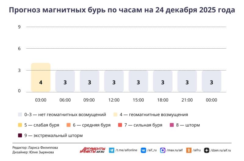 24 декабря продолжатся геомагнитные возмущения из-за действия корональной дыры на Солнце. Вероятность магнитных бурь составляет 26 процентов. Почасовой прогноз магнитных бурь по московскому времени смотрите в инфографике aif.ru.