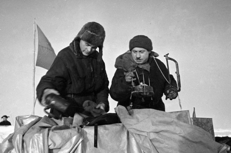 Начальник станции «Северный полюс» Иван Папанин (справа) и Петр Ширшов гидробиолог и океанограф упаковывают кухонную утварь во время эвакуации станции «СП-1». Фото: РИА Новости/ Яков Халип