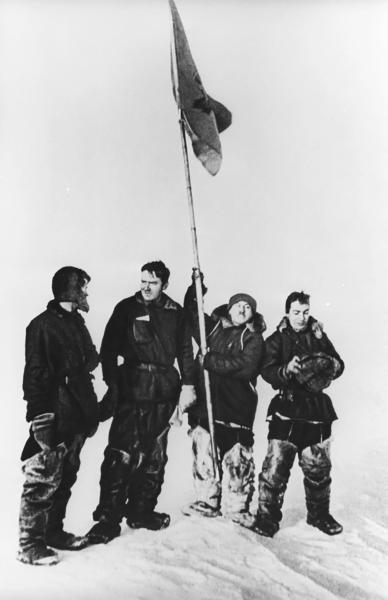 Гидролог Петр Ширшов, радист Эрнст Кренкель, начальник станции Иван Папанин, геофизик Евгений Федоров (слева направо) на открытии первой дрейфующей станции «Северный полюс», 6 июня 1937 года. Фото: РИА Новости