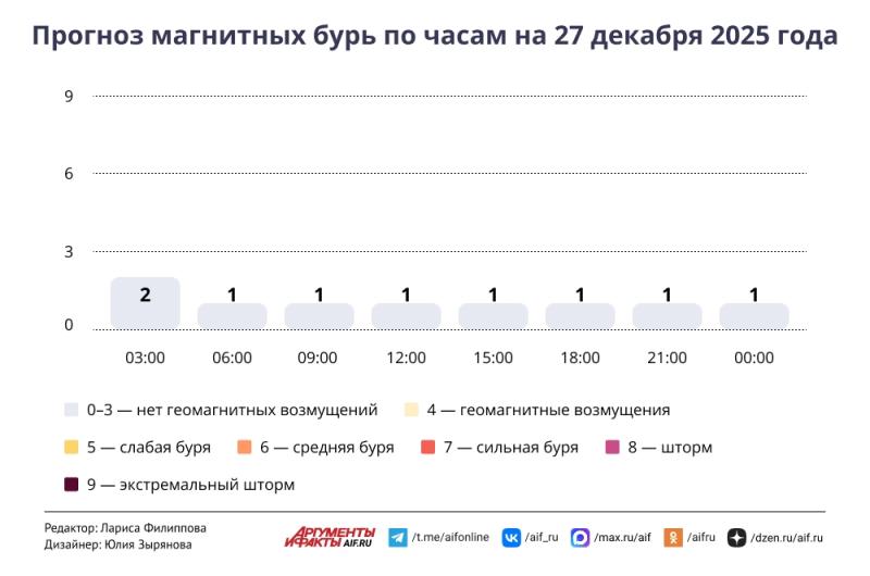 Прогноз магнитных бурь по часам на 27 декабря 2025 года. Инфографика