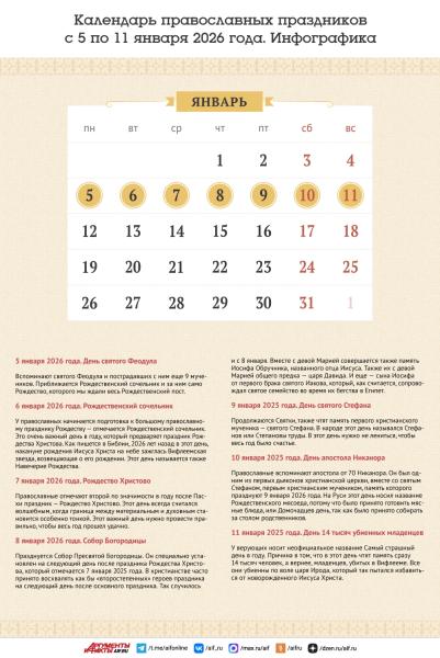 На неделе 5-11 января 2026 года заканчивается Рождественский пост. В среду, 7 января, отмечается Рождество, а перед ним — во вторник, 6 января, Рождественский Сочельник. На эту неделю приходится также Собор Пресвятой Богородицы. До конца недели отмечаются Святки.