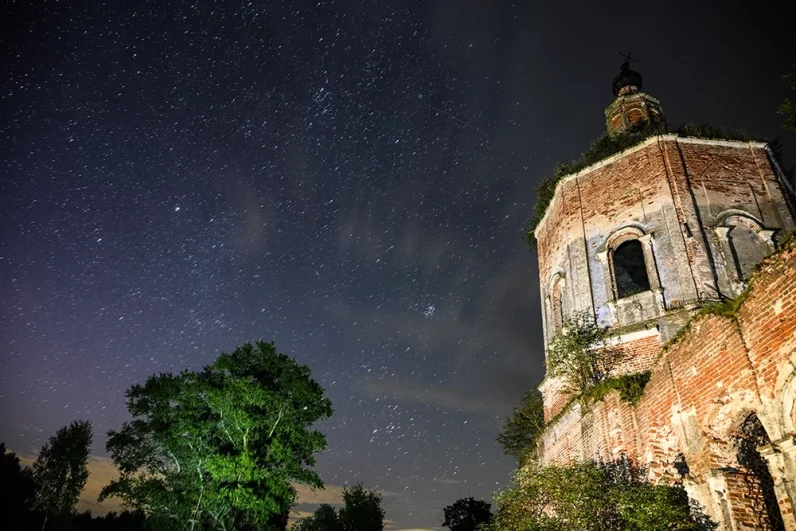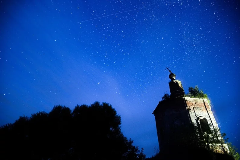 Звездное небо, наблюдаемое в селе Ивановское Тверской области, во время метеорного потока Персеиды. В кадре – церковь Иоанна Предтечи. © РИА Новости / Владимир Астапкович