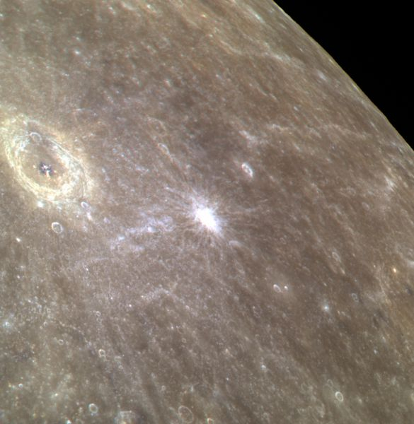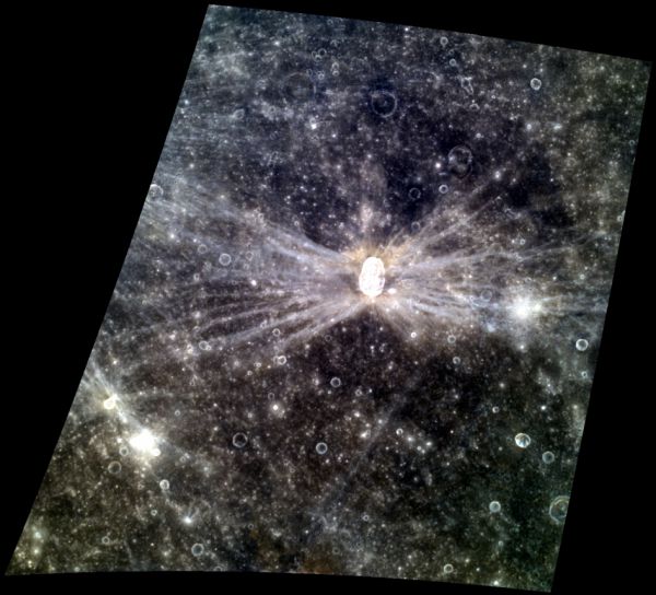 Такой красочной планету человеческий глаз увидеть не может. Разницу химических, физических и минералогических свойств Меркурия запечатлела одна из камер, установленных на станции. © NASA
