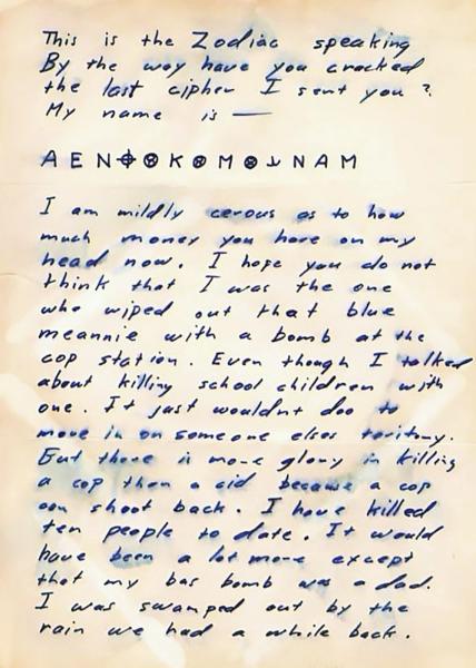 Отличительной чертой Зодиака стали его вызывающие письма в полицию. В посланиях он заявлял, что собирает рабов для загробной жизни, угрожал взорвать школьный автобус, рассказывал о планах новых убийств. Но не это было самым поразительным: в своих письмах убийца оставил четыре шифра, в которых скрыл информацию о себе. По заявлениям Зодиака, разгадав эти четыре кода, детективы смогли бы установить его личность. Вот только за пятьдесят с лишним лет удалось разгадать лишь две шифровки.